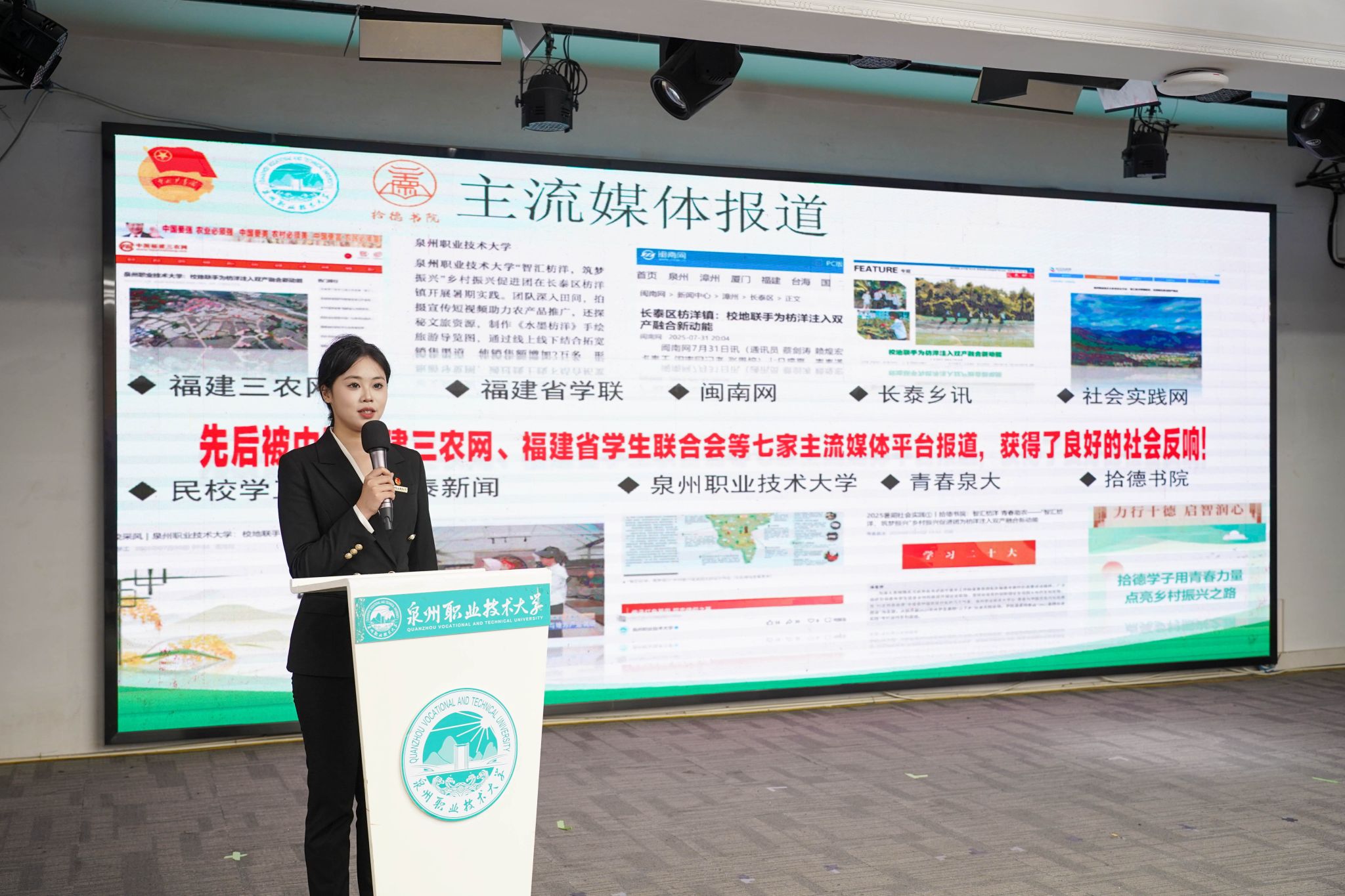 12月4日,泉州职业技术大学2025年暑期“三下乡”社会实践活动总结暨表彰大会在A633报告厅举行。晋江团市委副书记陈弘光,晋江团市委二级主任科员、组织部副部长李婷婷博士,内坑司法所所长苏雅雅,校务顾问、马克思主义学院首席专家来永宝,马克思主义学院院长杜秀娟,学工处处长、校团委书记黄胤聪,以及教务处、学工处、各二级学院负责人、各书院党团书记、实践团队指导老师和学生代表共同出席。校团委副书记曾子石系统回顾了...