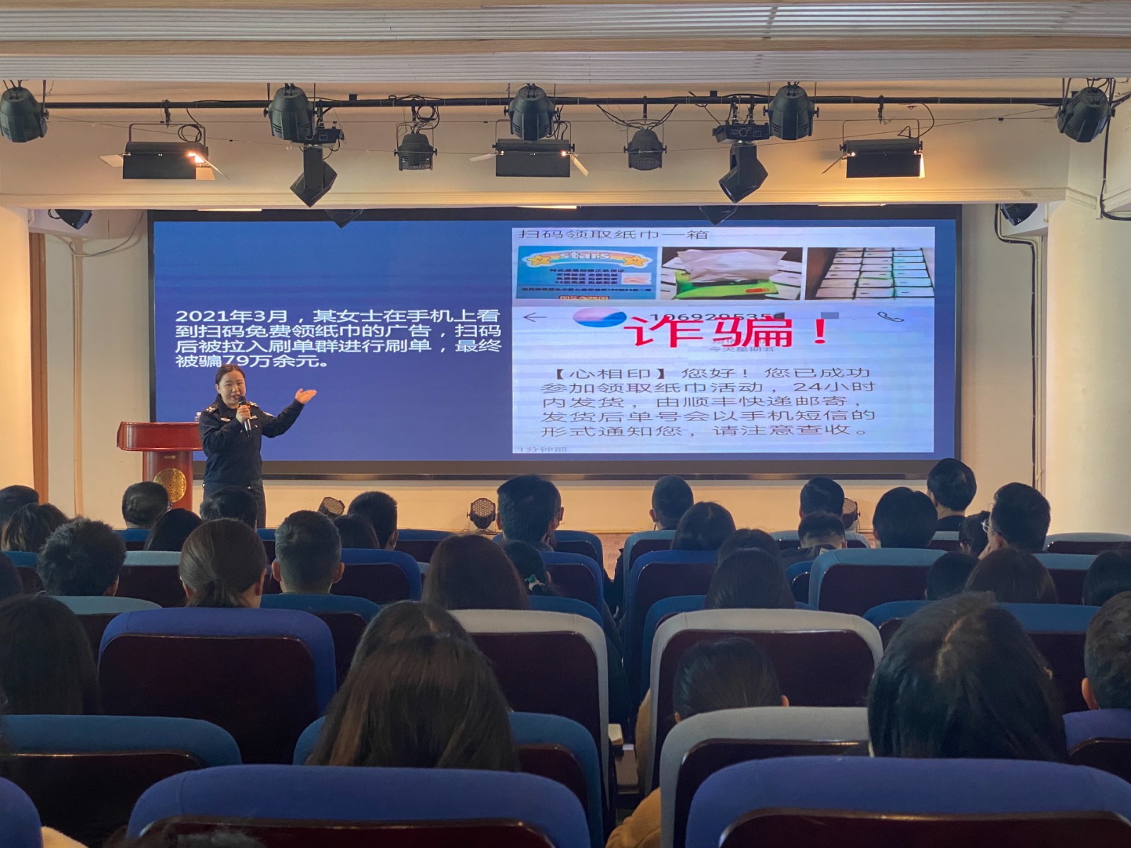 宣讲活动中,宣讲团的反诈讲师刘琪结合当前电信网络诈骗案特点,用小视频及PPT的形式,以通俗易懂的方式向参加活动的教职工介绍了常见的网络交友、兼职刷单、网络贷款、冒充客服、投资理财等电信网络诈骗形式,深入浅出地讲解了不法分子行骗的惯用伎俩和骗术。同时结合近期发生的多个真实案例,采取以案说法的方式揭露了网络诈骗手段,并总结如何正确防范该类诈骗行为,以防上当受骗。