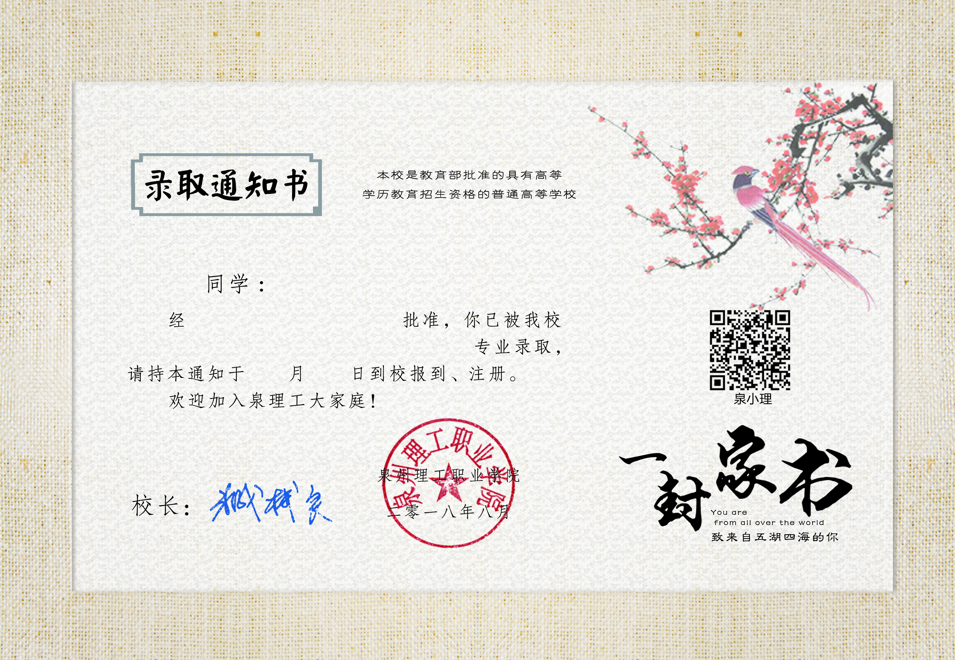 本次录取通知书以闽南元素为设计题材,今年是改革开放四十周年,践行晋江经验十五周年,所用元素皆源自于晋江本土文化。欢迎汝(Li)来:这是一句地道的闽南方言,我们热情好客,海纳百川,欢迎全国各地的学子成为新理工人。