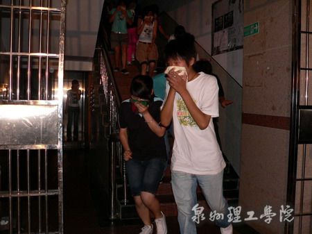 演练活动前,丰泽消防大队的蔡指导员在校学术报告厅举行了消防知识讲座。蔡指导员针对校园火灾的特点,结合丰富案例,向在场师生讲解了火灾成因及预防知识、疏散逃生常识,并现场示范了灭火器的使用方法。讲座后,同学们在学工处老师的统一指挥下,以湿毛巾捂鼻,模似火场逃生,以最快速度从消防通道安全下楼,在操场集合后,分组轮流使用灭火器进行实地灭火演练。而后进行施救伤员演练,由一名志愿者扮演在突发事件中受伤的学生,接到报告后,现场指挥通过广播通知医务室、校卫队紧急出动人员抢救伤员,在现场对伤员进行紧急护理后,由校车送往医院抢救。在紧急疏散演练中,各楼栋参演同学在接到广播通知后,直奔指定地点集合,由各楼管迅速清点人数无误后,全部演练项目完毕。最后,活动总指挥毛伟雄副书记对演练活动进行了总结,宣布本次演练圆满结束。