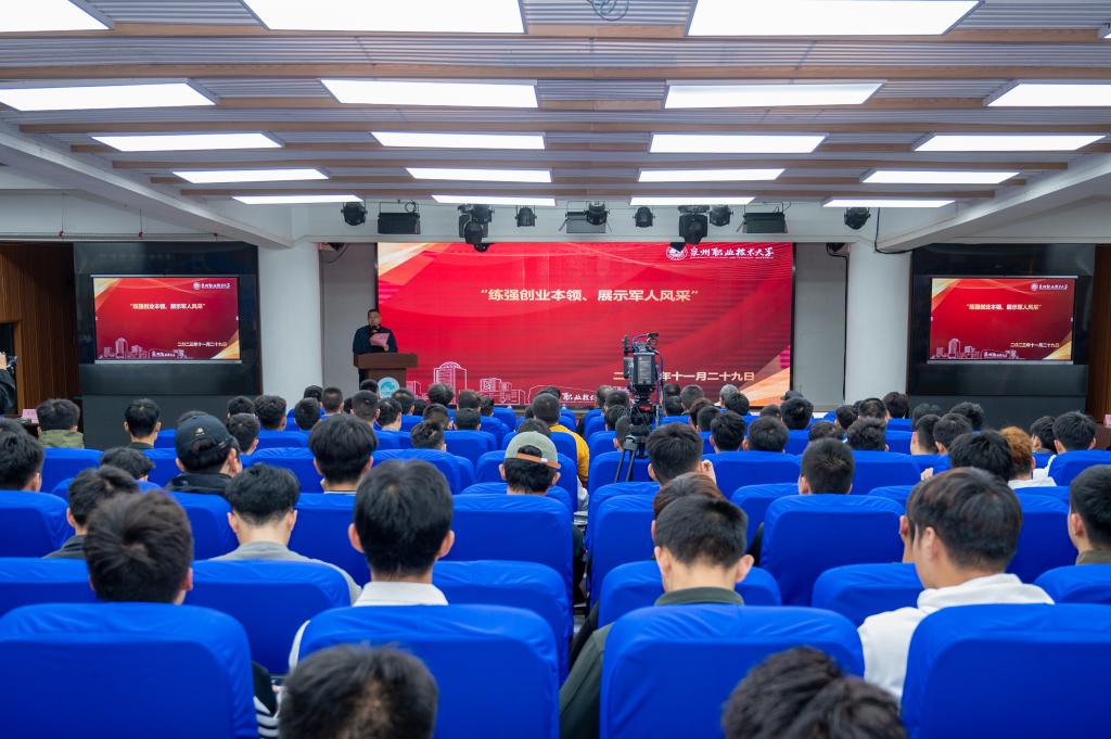 11月29日,泉州职业技术大学召开“练强创业本领,展示军人风采”退役军人报告会,进一步增强大家就业创业意识,提升就业创业能力。出席报告会的有学校创办人、董事长吴金营,校党委书记傅志雄,副校长张建军等校领导,校武装部工作人员、各书院书记,及有部队服役经历的教师,与300多位退役大学生。报告会由武装部部长杨津平主持。
