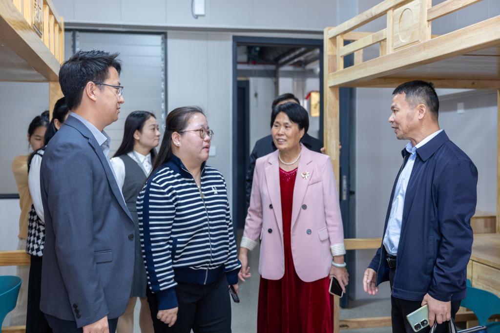 张阿芬一行先后参观了我校生态校园沙盘、校史馆、艺术设计展厅、直播基地、数智产教融合展厅、“一站式”学生社区、新能源汽车产业学院等,吴滨如向其介绍我校办学成果及产教融合实践举措。