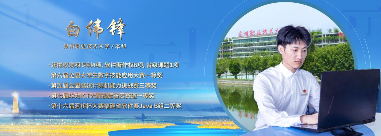 白伟锋,汉族,中共预备党员,联合创新产业学院2021级软件工程技术专业2班学生。曾获第六届全国大学生数字技能应用大赛一等奖、第十六届蓝桥杯大赛福建省软件赛Java B组二等奖等奖项,共计国家级奖项5项,省级奖项3项,市级奖项1项;围绕火灾预警等领域进行研究,获国家级发明专利4项,计算机软件著作权6项,1项省级课题立项。