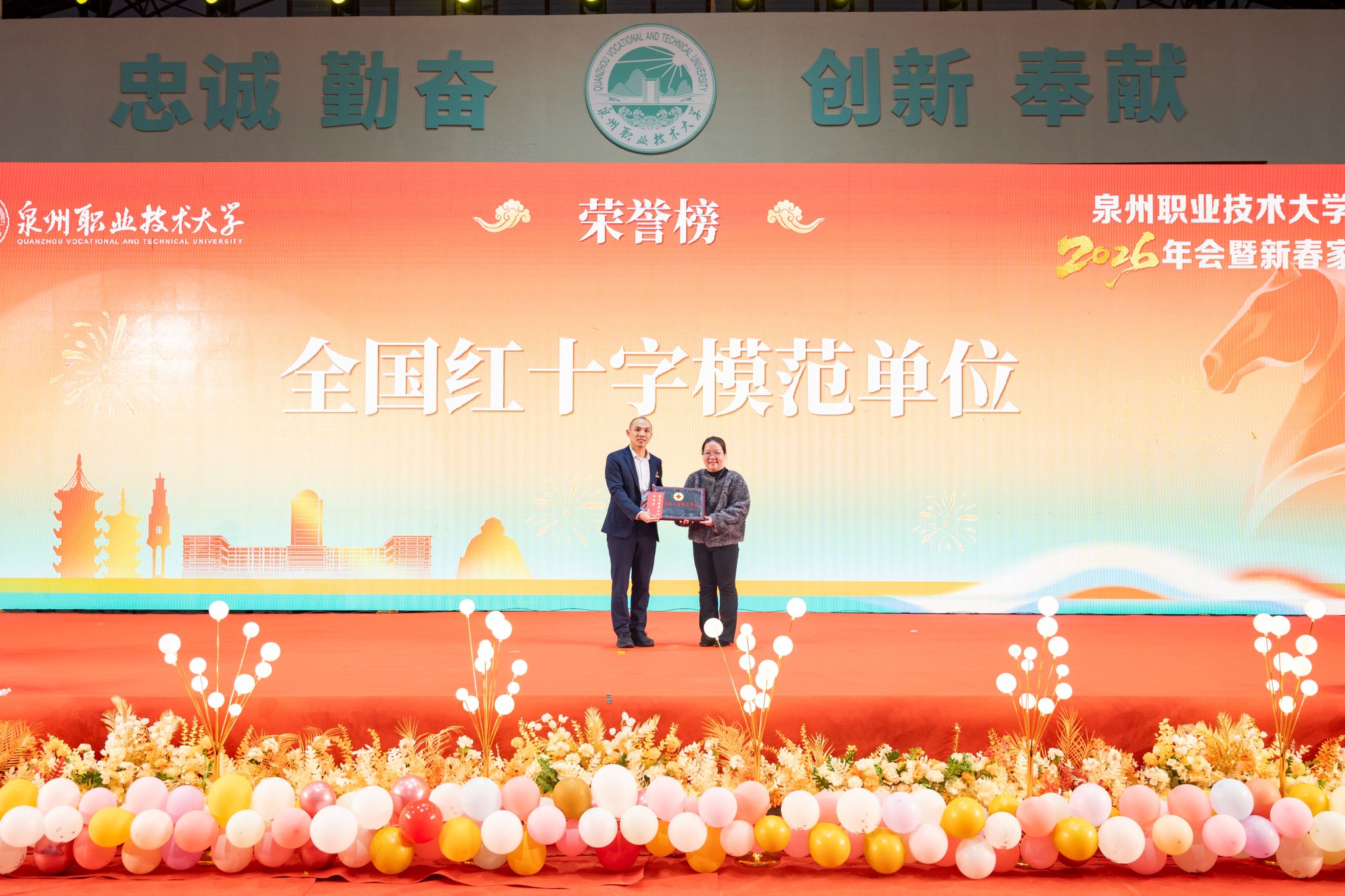 1月20日,泉州职业技术大学隆重举行2026年会。学校创办人、董事长吴金营,泉大教育基金会理事长杨培琛,校长吴滨如,党委书记傅志雄,全体校领导、教职工及产业伙伴代表、南非培训学员参加。年会由傅志雄书记主持。