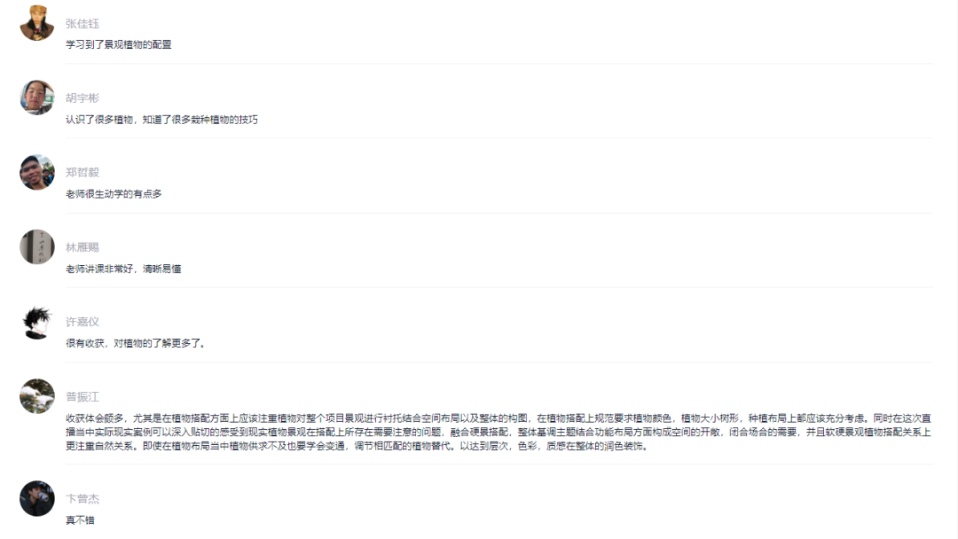 “开阔的阳光草坪可以营造出活力的开敞空间,密植的林荫小道可以营造出宁静的密闭空间,由植物半围合的木平台可以营造出休闲的半开敞空间。”陈老师拎着直播手机,边走边讲,同学们则在后台不断留言点评。