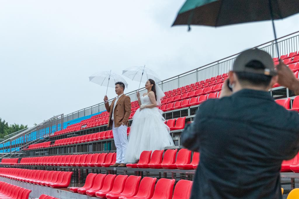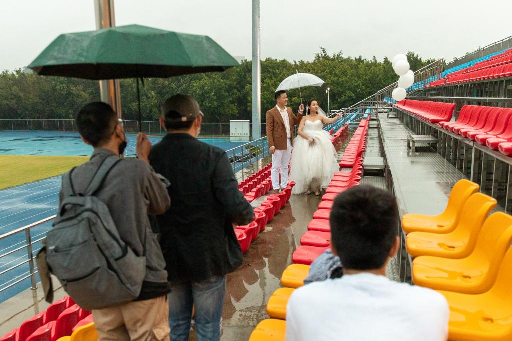 这一天,天上飘着蒙蒙细雨,校园里到处湿漉漉的。他们风雨无阻,按约定来到校园。“前两次,因为疫情等原因,迟迟不能来学校拍照。这是第三次了,我们不能再错过机会。”新郎伸出手感受细雨,他说,校园是他们相遇、相识的起点,婚纱照如果没有这里的风景,他们会感到很遗憾,即使冒雨也要赶来学校。拍照行程紧,回到母校,他们也很匆忙。新郎忙前忙后,一会给新娘递水,一会帮她提婚纱的裙摆。看着他满头大汗,新娘不时拿纸巾帮他擦拭。