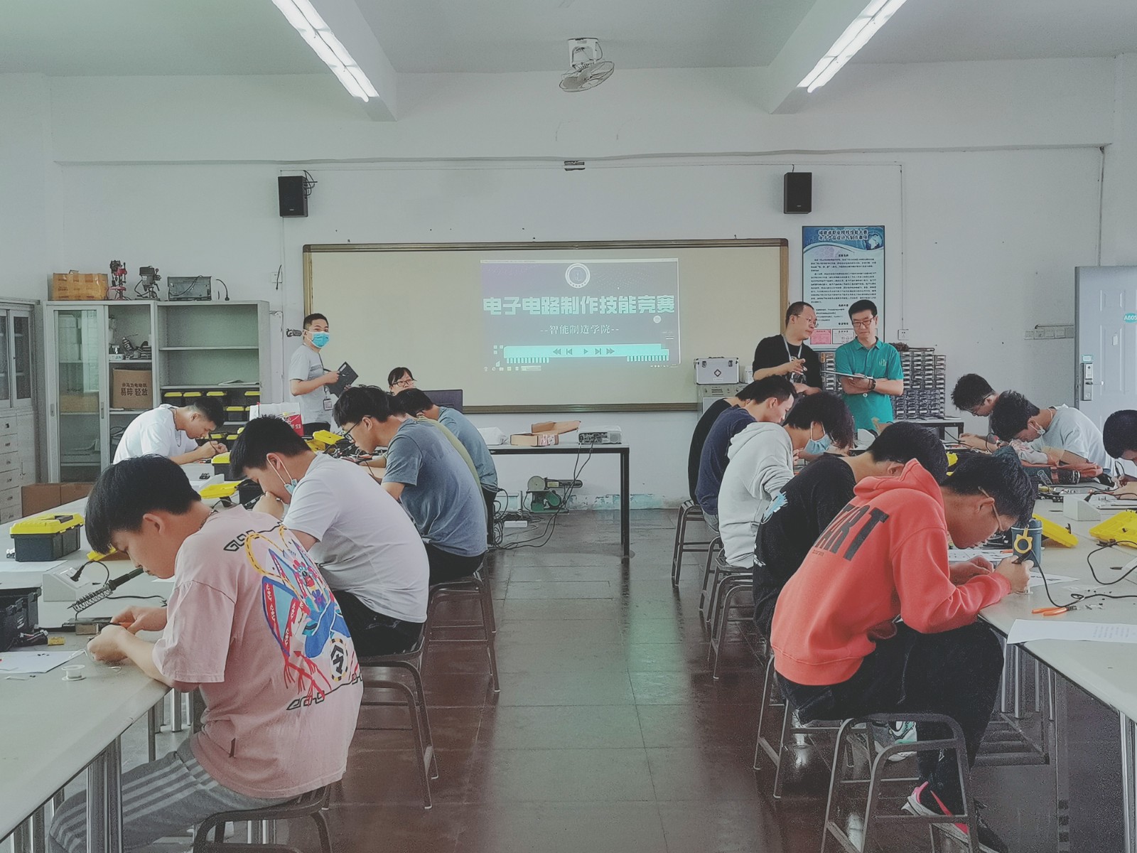 为了巩固和提升学生电子电路制作技能水平,智能制造学院于5月25日在A605电子产品维修实验室举办首届电子电路制作技能竞赛。出席本次竞赛的评委有智能制造学院专业教师陈庆文老师、智能制造学院专业教师王燕平老师、国科数字产业学院实验员黄东明老师、智能制造学院实验员叶建德老师。