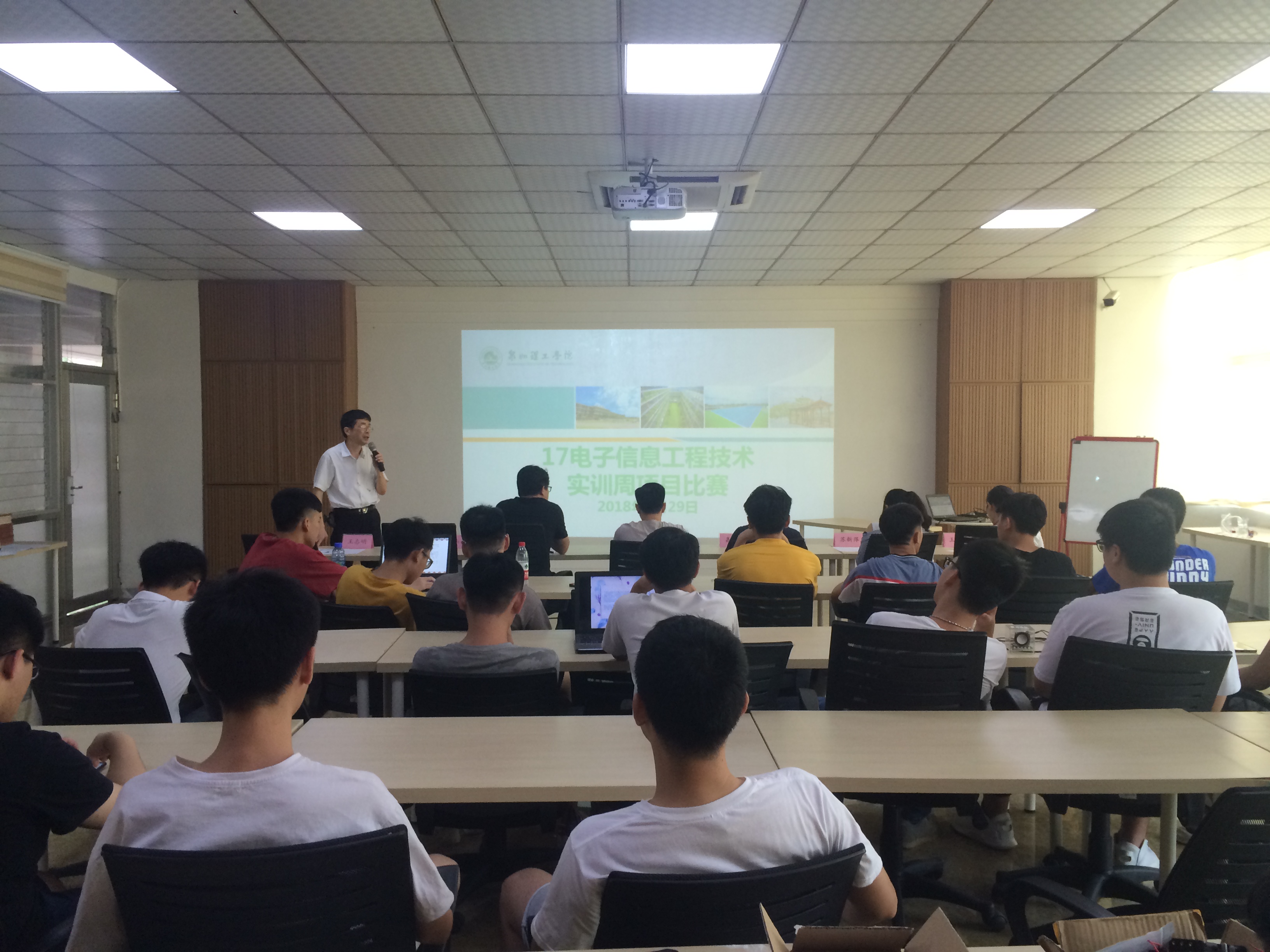 6月29日上午,我系电子信息工程技术专业在校主楼第二会议室举行17级电子信息实训成果汇报会。会议邀请了科研处郭霏霏老师、教务处许亿老师、工学院张水参老师,及电子信息专业王燕平老师,苏新萍辅导员等担任评委,会议由电子专业主任王志明老师主持,17级电子信息工程技术专业全体学生参加了本次活动。