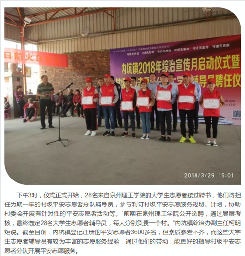 28名来自泉州理工学院的大学生志愿者走马上任,辅助、指导村级开展平安志愿工作。