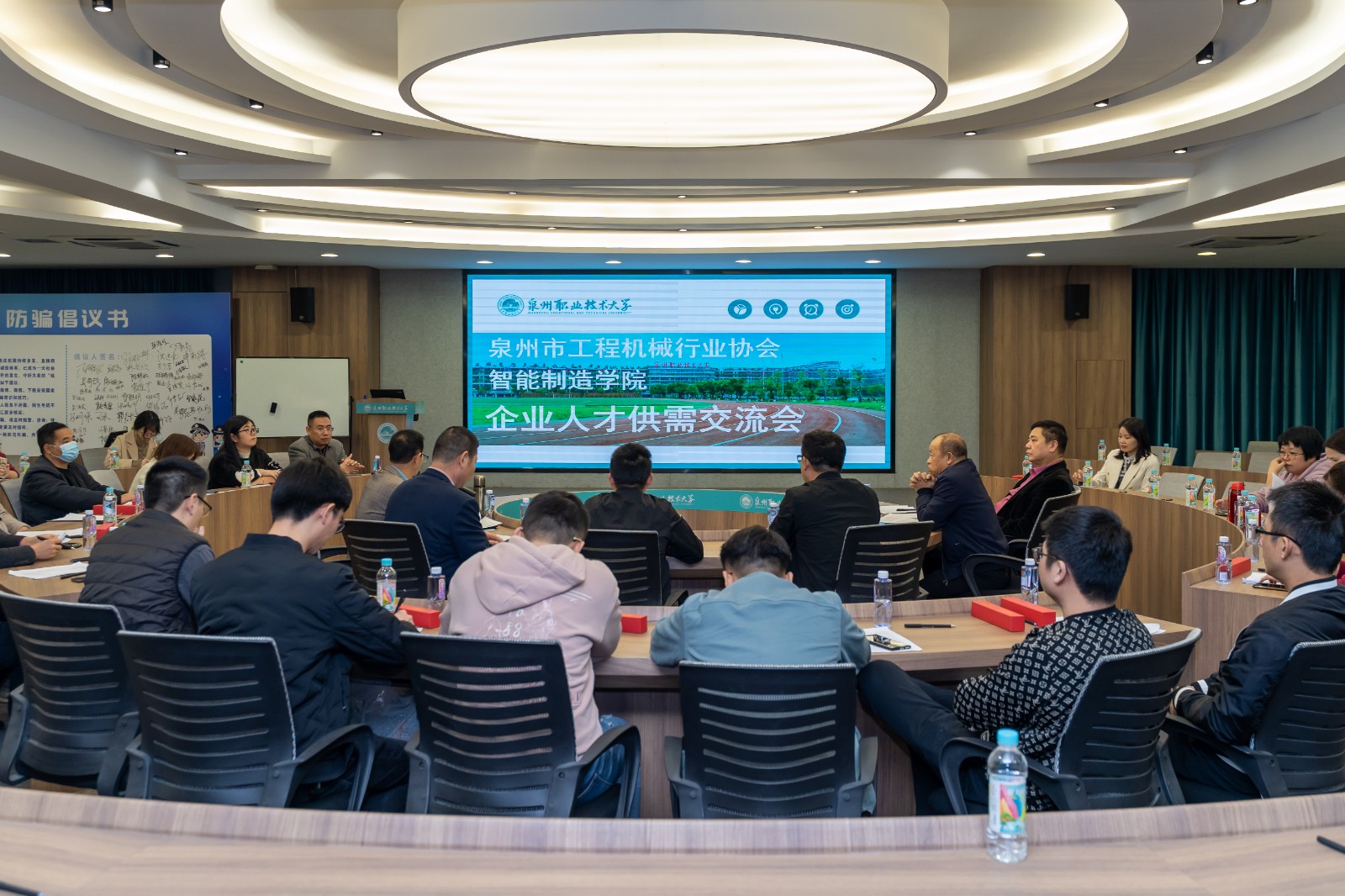 本次会议邀请泉州市工程机械行业协会下属等十余家企业代表参会。副校长郭霏霏、智能制造学院书记蔡海毅、学院教师代表等参加会议。会议由泉州市工程机械行业协会秘书长吕华元先生主持。