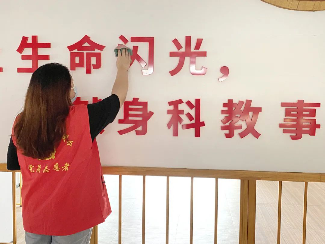 在校党建馆内,化身为“小红人”的志愿者们,强强联动,清洁着党建馆的每一处角落。