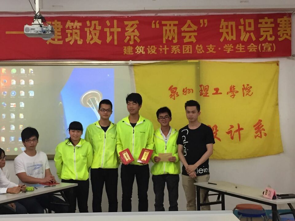为进一步学习“两会精神”,践行社会主义核心价值观。4 月 28日晚7时,建筑系“博识通达·聚焦两会”主题知识竞赛在教学楼238教室拉开了决赛的帷幕。参加本次的比赛的评委嘉宾有学工处处长杨津平、信息系党总支书记黄镇红老师、学工处叶静老师、车辆系辅导员黄胤聪老师、商学院辅导员蔡丽勤老师、建筑系团总支书记黄荣峰老师、辅导员王秋玲老师、建筑系14级学生及全体学生会成员。